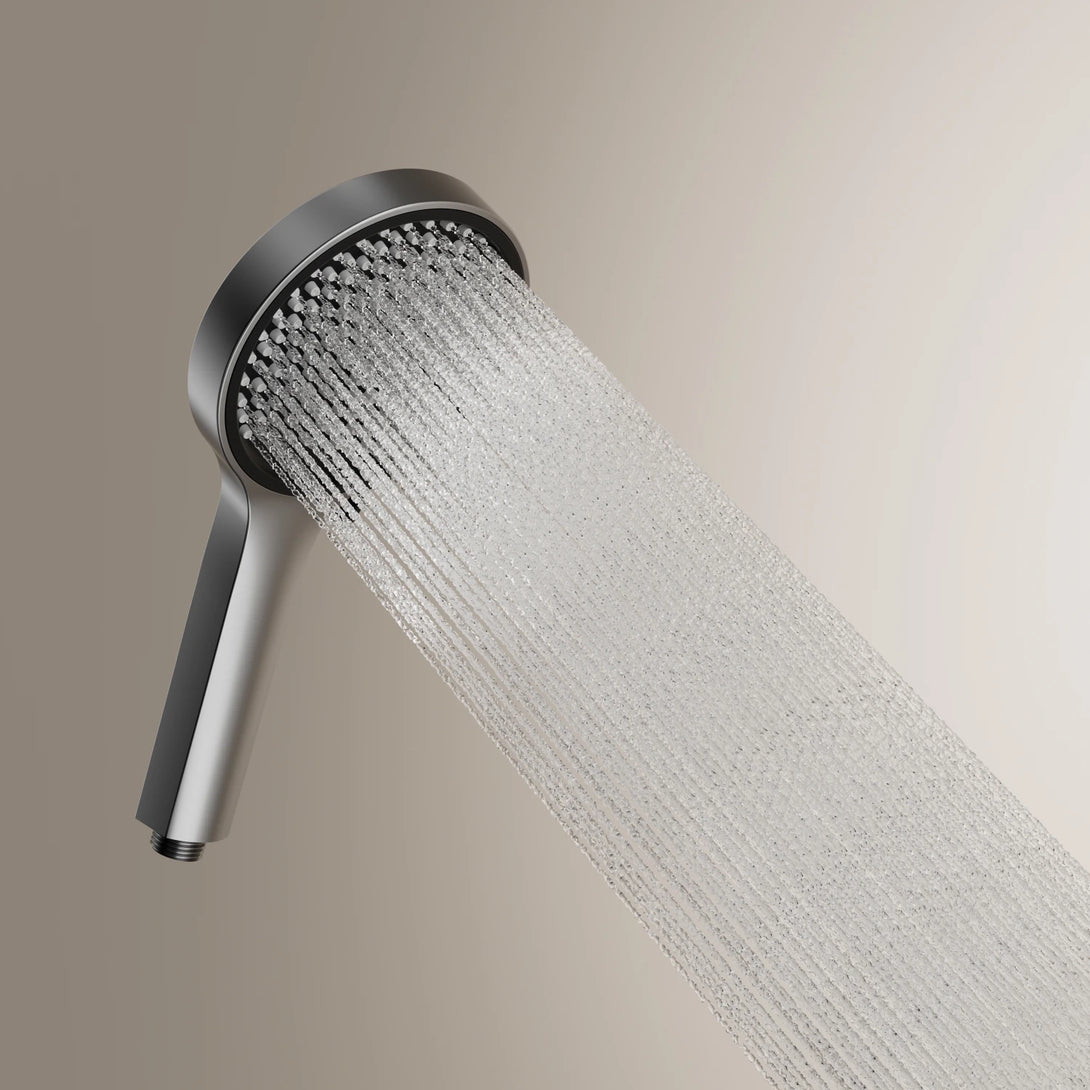 The circular overhead shower produces a natural, wide rain-like flow that envelops your whole body, creating a soothing spa-style shower experience.